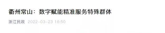 近日,“浙江民政”微信公眾號(hào)以“衢州常山:數(shù)字賦能精準(zhǔn)服務(wù)特殊群體”為題,報(bào)道了衢州市數(shù)字化改革聚焦“一老一小”民生改善工作,一項(xiàng)項(xiàng)惠民舉措,極大地提升了老少群體的獲得感、幸福感、安全感。今年3月,“一老一小”工作入選浙江省民政數(shù)字化改革重大應(yīng)用建設(shè)試點(diǎn)。