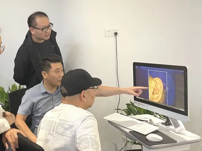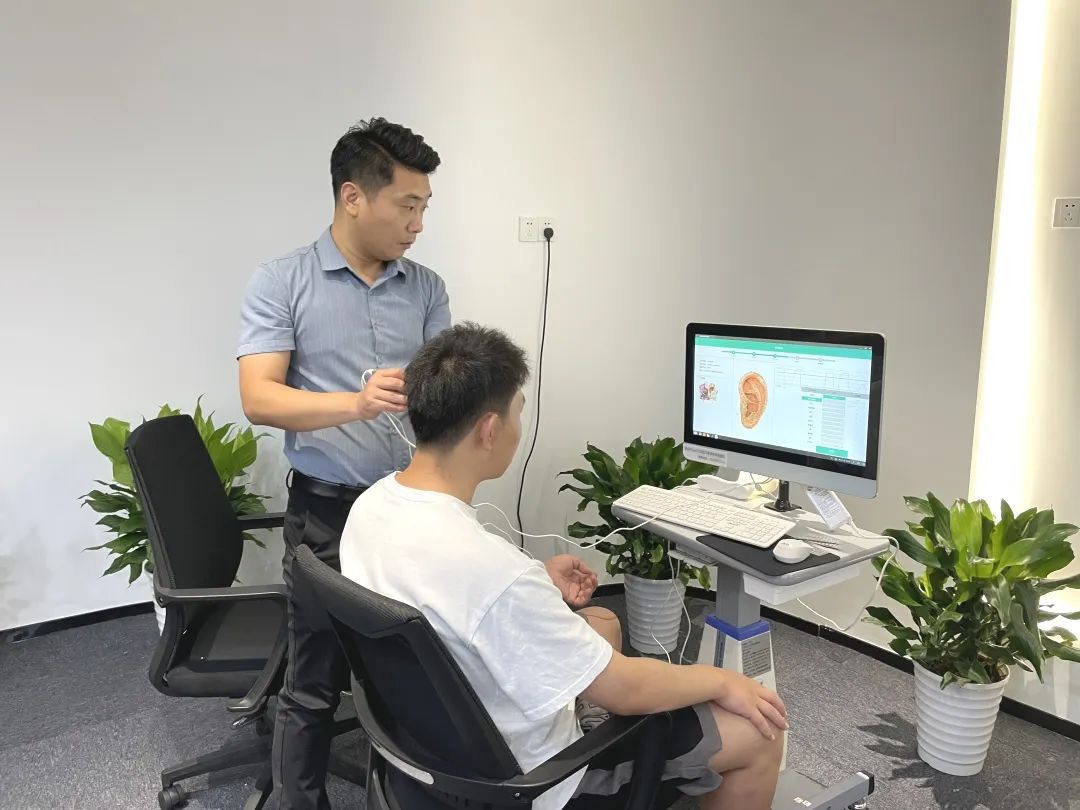 不同于常規(guī)的體檢,中醫(yī)耳穴診療只需要一支耳穴檢測筆、一臺(tái)電腦就可以操作了。耳穴檢測操作師李東飛老師在員工手腕部貼上導(dǎo)聯(lián)電極,并通過對(duì)兩只耳朵的耳像采集,同時(shí)輸入相應(yīng)參數(shù),即可在電腦上生成該員工的“耳穴檢測報(bào)告”。耳穴檢測完成后,診療師再根據(jù)耳穴檢測報(bào)告,實(shí)施“耳穴貼壓治療”方案。耳穴貼壓前,員工們先享受了一輪耳廓按摩服務(wù)。你可別小瞧這按摩,除了能帶來舒適的按摩體驗(yàn)感,其最大目的是調(diào)動(dòng)耳廓的氣血,讓貼壓效果更好。