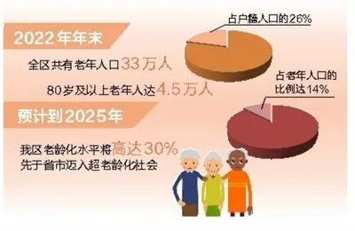 首先我們來(lái)看下蕭山的老年人口,蕭山作為杭州唯一一個(gè)人口規(guī)模超200萬(wàn)的區(qū)縣,也是老年人口最多的區(qū)縣。2022年年末,全區(qū)共有老年人口33萬(wàn)人,占戶籍人口的26%,80歲及以上老年人達(dá)4.5萬(wàn)人,占老年人口的比例達(dá)14%左右。預(yù)計(jì)到2025年,我區(qū)老齡化水平將高達(dá)30%,先于省市邁入超老齡化社會(huì)。