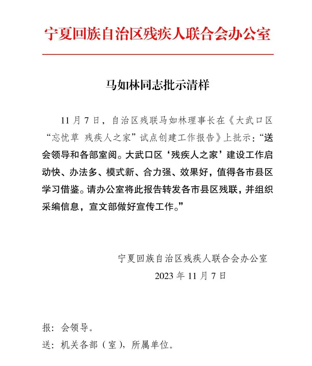 近日,寧夏回族自治區(qū)殘疾人聯(lián)合會辦公室發(fā)布馬如林理事長對《大武口區(qū)“忘憂草·殘疾人之家”試點創(chuàng)建工作報告》的批示。馬如林理事長表示,大武口區(qū)“殘疾人之家”建設工作啟動快、辦法多、模式新、合力強、效果好,值得各市縣區(qū)學習借鑒。