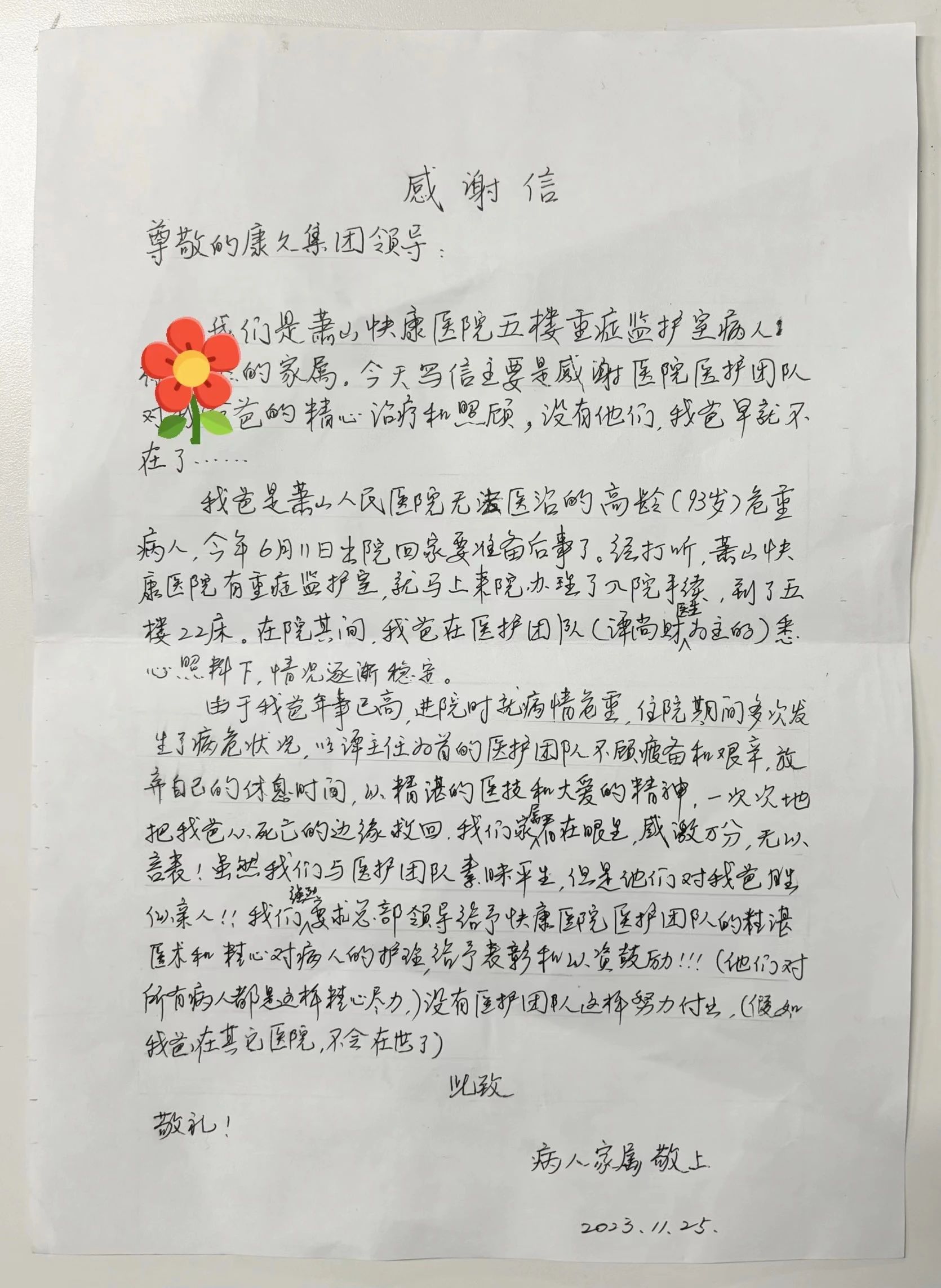 日前,一封患者家屬徐先生一筆一畫手書的感謝信送到了康久集團(tuán)總部?!搬t(yī)護(hù)團(tuán)隊(duì)以精湛的醫(yī)技和大愛的精神,一次一次把我爸從死亡的邊緣救回,我們家屬看在眼里,感激萬分,無以言表。雖然我們與醫(yī)護(hù)團(tuán)隊(duì)素昧平生,但是他們對(duì)我爸勝似親人……”這封語(yǔ)言樸實(shí)、感情真摯的感謝信,感謝的正是蕭山快康醫(yī)院后ICU病區(qū)譚尚財(cái)主任帶領(lǐng)下的醫(yī)護(hù)團(tuán)隊(duì)。