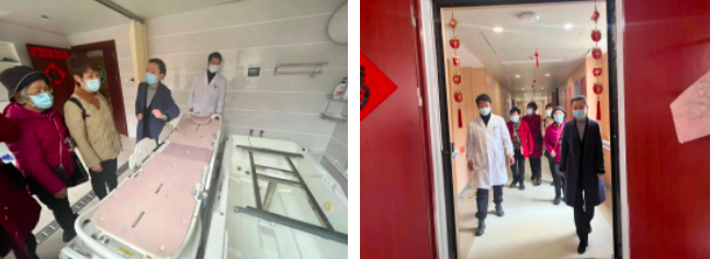 考察組一行實地參觀了普陀康久醫(yī)院、普陀天頤老人之家健康自理區(qū)、小單元多功能集中養(yǎng)護(hù)區(qū)、智能助浴室、認(rèn)知障礙照護(hù)專區(qū)、活動室等功能區(qū)域。