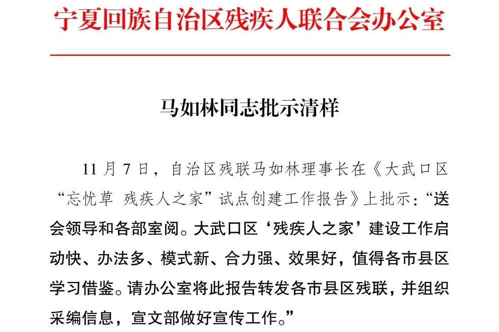 近日,寧夏回族自治區(qū)殘疾人聯(lián)合會辦公室發(fā)布馬如林理事長對《大武口區(qū)“忘憂草·殘疾人之家”試點(diǎn)創(chuàng)建工作報(bào)告》的批示。馬如林…